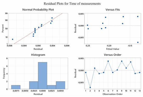 The results of the analysis of variance in relation to individual elements of the coordinate measurement time model are presented in Table 3, in which the columns DF, Adj SS, Adj MS are the total degrees of freedom, adjusted sums of squares and adjusted mean squares, respectively. Adj SS and Adj MS were used to calculate the p-Value for a term and the coefficient of determination. In turn, the F-Value was used to calculate the p-Value, which was used for making a decision regarding the significance of the terms and the model [39]. It was possible to determine those model components for which the p-Value is less than the established significance level by means of the results of the analysis of variance. A significance level of 5% was used during the analysis. The significance of the individual components of the coordinate measurement time model was determined based on the analysis of variance. Moreover, the results of the analysis of variance included information on the accuracy of the model in representing the measurement data. The p-Value parameter in the case of Lack-of-Fit indicates the insignificance of the lack of fit of the considered model. This means that the proposed model (1) can be regarded as sufficiently accurate.