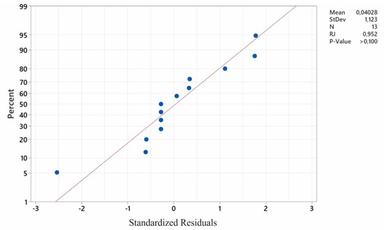 Figure 7 presents the residual plots. They can be used for reference only. Inferring compliance with the normal distribution requires conducting a residual normality test. The results of the normality test are presented in Figure 8. The Ryan–Joiner test was applied. On the basis of the results presented in this graph, there are no grounds to reject the hypothesis of a normal distribution of the population from which the analysed sample was sourced. This means that the model is correctly constructed and calculated, and is not biased; i.e., it does not underestimate or overestimate the results.