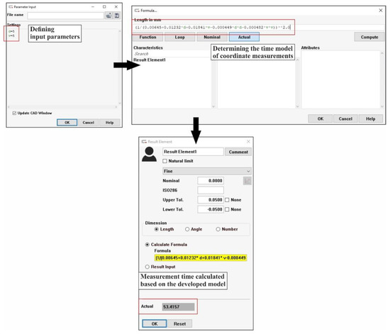 The coordinate measurement time model developed was implemented in the Calypso software cooperating with the applied CMM ACCURA II. This process was carried out using the PCM parametric programming module of the above-mentioned metrology software. In the first stage of implementation, two parameters corresponding to the input parameters (distance between measurement paths and scanning velocity), were created in the Calypso software. The values of the input parameters can be imported into Calypso through a text file. In the next stage, the equation of the contact coordinate measurement time model was determined. The last stage concerned the calculation of the time needed for the coordinate measurement process on the basis of the imported values of the input parameters (Figure 12). The calculated time corresponds to the value of the output parameter shown in Figure 10 and Figure 11.