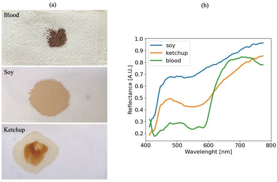 In order to collect data for the training of an ANN capable of recognizing pixel belonging to blood and non-blood stains, four separate substrates of pink cotton, blue cotton, white cotton, and light wood are prepared on which soy and ketchup stains are deposited. Figure 4 shows how visually the stains of different materials may look very similar to each other (a), but by analyzing the average reflectance spectra, the blood retains its typical, clearly recognizable characteristics (b).