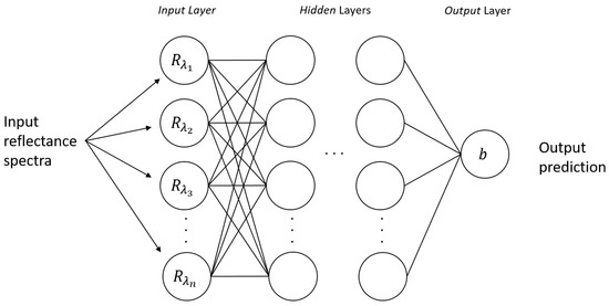 Before creating a model capable of correcting the effect of the substrate on blood deposited on a surface, it is necessary to be able to distinguish spectra belonging to a blood stain from spectra belonging to other substances, even those that are visually very similar. An MLP network is exploited to perform a binary classification of the collected spectra. MLP has been used for a long time in numerous scientific and technological sectors and has proven to be able to solve very complex problems in several fields [17]. This model architecture is able to predict new continuous outputs from new statistically independent input data starting from a set of continuous input–output variables. The artificial neuron is the basic element of an MLP. This is a module that sums weighted inputs and passes them through a cost function that determines its output. One or more neurons are arranged into layers of neurons and several layers are arranged into a network of layers, also called neural network. The selection of the activation functions, the number of layers, and the number of neurons for each layer, depend on the complexity and the nature of the problem under examination. The weights of the model are trained by a back-propagation algorithm, typically exploited in a supervised learning technique [18,19,20]. The model proposed in this paper is shown in Figure 5. The ANN takes reflectance spectra as input, and as output, returns a single value b: 1 if the spectrum belongs to a blood stain, 0 in all other cases.