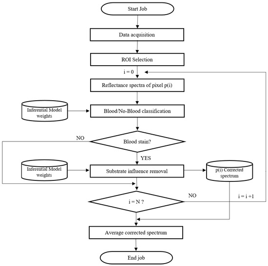 The procedure workflow for the blood stain identification and for the correction of substrate spectral distortion in the blood reflectance spectra is shown in Figure 7 and can be described as follows.