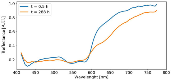 Figure 8 shows the reflectance spectra of blood stains on the reference white tile substrate in the visible and NIR range. The blue curve represents the reflectance spectrum acquired at time h where the typical blood features are visible, i.e., the absorption peaks of , at 416 nm (the Soret peak), 542 nm (the band) and 576 nm (the band), and the characteristic narrow slope of fresh blood in the spectral band extended between 600 nm and 650 nm. The orange curve, instead, is the reflectance spectrum acquired at time h. In this case, it is possible to observe significant differences in blood spectra, not only related to the decrease of and peak intensities, but also a softer transition from to . As clearly visible at 620 nm, the curve changes convexity and its slope decreases.