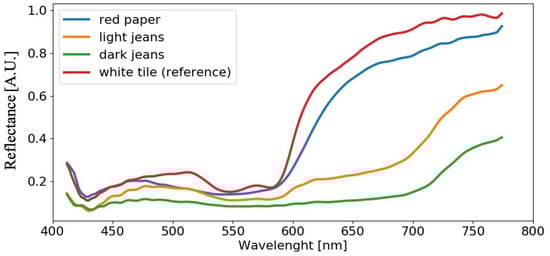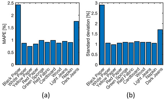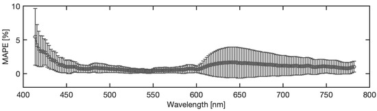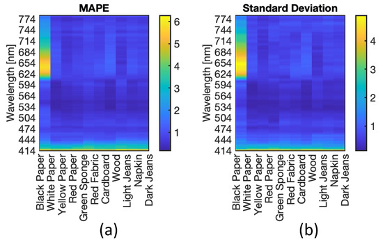 The MAPE and standard deviation of each substrate are reported also in Figure 16, but averaged within all the spectral wavelengths. It is confirmed that the standard deviation is large in the case of dark colored materials, e.g., black paper and dark jeans. However, the black jeans substrate presents a MAPE lower than other substrates (Figure 15). This is because, due to the texture of the material, it suffers from greater variability, and when averaged, the effect is compensated for.