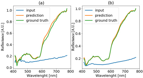 The method proposed in Section 3.3 is applied to hyper-spectral images of blood stain deposited on wood and black paper at time h of ageing. Results are reported in Figure 10 and Figure 11, respectively. In the left plots of both figures, the blood spectrum in one pixel of the blood stain image is presented, while in the right plots, the average spectra obtained by averaging the spectra over all the pixels of the stain are presented. The blue line represents the input spectrum, the orange line is the reference white-tile spectrum, and the green line is the predicted corrected spectrum. Even starting from a reflectance spectrum that is greatly altered by non-collaborative substrates (e.g., wood or black paper), it is still possible to reconstruct the spectrum unaffected by the substrate (Figure 11). In the case of black paper, the blood stain, as shown in Figure 3, is not visible to the naked eye because it is completely covered by the color of the surface on which it is deposited. In both cases, it is evident how crucial it is to consider the average of all acquired spectra. In fact, the spatial averaging allows to get rid of the non-homogeneous sample texture which is a characteristic of typical materials considered in forensics. In the case of black paper, it can be noticed that the main deviation from the ground truth is in the wavelength range between 600 nm and 700 nm, as it will be confirmed in Section 4.5.