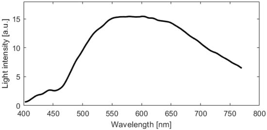 The camera is set on top of the blood stain sample in between of two halogen lamps, as shown in Figure 2. The use of halogen lamps provides uniform, broadband illumination, which is essential to ensure the right light intensity over a wavelength range as wide as possible. The choice of the light properties in terms of spectral content (broadband vs. narrow-band), directional distribution (directional vs. diffuse), and uniformity over the sample surface, is crucial for the accuracy of the image registration. The spectral analysis is limited to the range between 412 and 774 nm, with a step size of 2 nm (185 nominal spectral bands), since the maximum spectral intensity of halogen lamps falls within this range. As explained in Section 1, this interval includes characteristic features of blood.