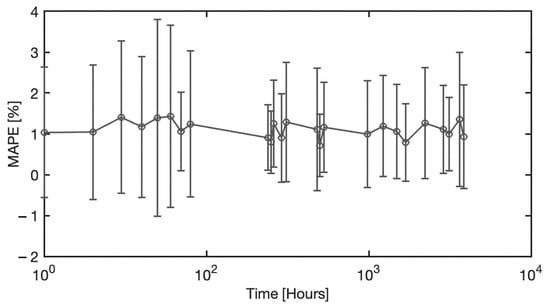 Since one of the other parameters considered in the study presented in this paper was the age of the blood stain, the MAPE has been analyzed as a function of the acquisition times of all the samples. Its trend is plotted in Figure 17. The average MAPE is represented by the circles, while the vertical bars represent the standard deviation. It can be observed that the MAPE and its variance are stable near to zero, and therefore, it is possible to conclude that the MAPE is independent from the blood stain age.