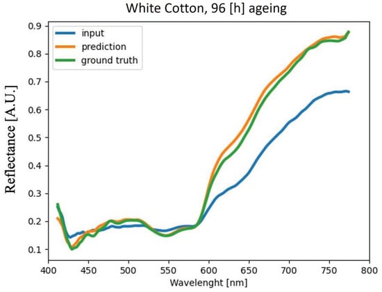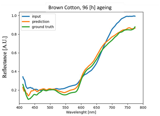 The method proposed is finally applied on blood stains deposited on two new materials different from the ones used for the network training: brown and white cotton. The acquisition is carried out at different times of blood ageing: 1, 24, 47, and 96 h. Again, blood deposited on a white tile is used as a reference. The results in terms of MAPE are shown in the Table 2; it is evident that the error is always below 5%, as it was for the materials used for the network training (Figure 17). As shown in Figure 18 and Figure 19, the method succeeds in reducing the substrate effect on reflectance spectra of blood stains deposited for 4 days also in complex substrates such as a brown cotton fabric (Figure 19).