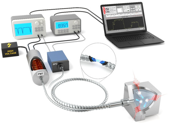 We used two transmitted scintillation detectors to develop and characterise the fibre optic dosimeter: the single-photon counter (LaserComponents) with a detection wavelength range from 380 nm to 500 nm and quantum efficiency of 45%. The output of the SPC is a preprocessed transistor logic signal (TTL) with a dark count rate of 10 counts/s. The SPC has an active area diameter of 100 µm with a typical dead time of 45 ns. The SPC has the advantage of small size and a 24 V power supply. This leads to more straightforward electrical wiring where a high voltage divider and other electronics are not required. The disadvantage is the smaller diameter of the active area and the associated complexity of concentrating the scintillation light from the optical fibre onto the active chip.