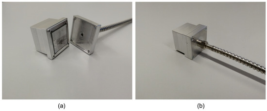 The following sensor design has already been performed for specific scintillation crystals and the connection to the fibre optical link with the SMA905 connector. The construction of the sensors consists of the scintillation crystal, a housing, and a fibre optic connection. The aluminium housing tightly encloses the scintillation crystal, preventing mechanical damage and irradiation by external light. The housing is designed so that there is an equal amount of construction material between the ionising radiation source and the scintillation material in all directions. The entire sensor consists of a sensor body with a scintillation crystal and a lid with an SMA905 connector for connecting the optical fibre. The fibre is threaded onto the sensor lid after the lid is closed (see Figure 3). This ensures that the end of the optical fibre and the front side of the sensor crystal are always in the same relative position. In addition, the scintillation crystal is covered on five sides with Teflon tape, which reflects more than 95% of the light in the light spectrum around 400 nm [27]. Due to the crystal’s small size, we could couple slightly more scintillation radiation into the optical fibre with this approach.