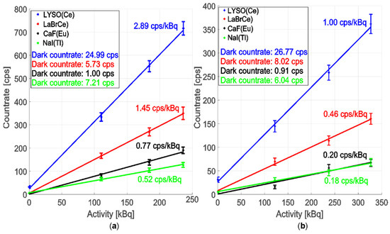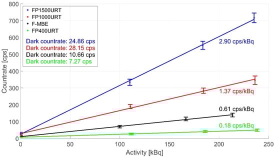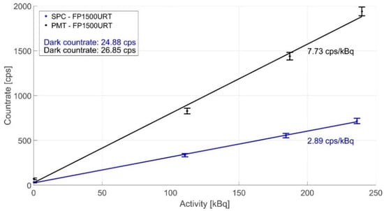 With the aforementioned experimental procedure, we further investigated the sensitivity using both detectors and several gamma radiation sources. The results in Figure 5 indicate that both detectors’ sensitivity is roughly comparable. The efficiencies of the PMT and SPC are 7.73 and 2.89 cps/kBq, respectively. Due to the larger detector area diameter, the photon countrate from the PMT is 2.5 times higher, although the quantum efficiency of 20% is lower than the SPC. Thus, the PMT comes out as a more sensitive detector and allows a more detailed analysis of the detected photons due to the direct output without additional electronic elements.