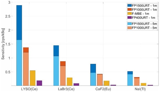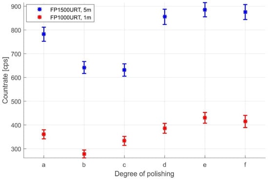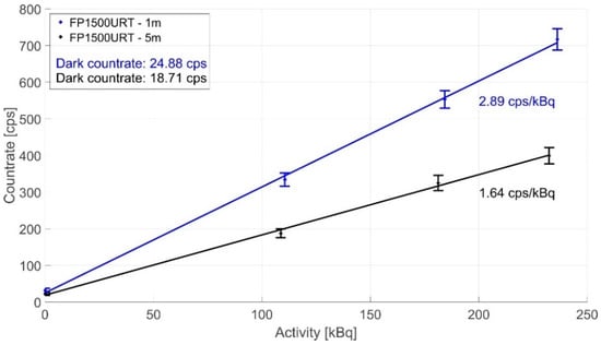 Figure 9 compares the FP1500URT 1 and 5 m optical fibre measurements. We used the ID1–ID3 ionising radiation sources for the measurements and the LYSO scintillation crystal sensor. The optical fibre length of 5 m was chosen because it is already sufficient for separating sensors and electronics in most potential applications safely. The comparison shows that a 5 m optical fibre has a sensitivity of 1.64 cps/kBq due to its higher attenuation, while a 1 m optical fibre has a sensitivity of 2.89 cps/kBq.