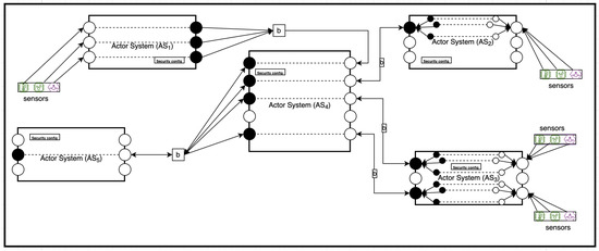 Figure 1 illustrates an example scenario for the interaction between IoT devices. A rectangle represents an AS’s boundary, representing a single IoT device. Each device has a set of ports using which it could communicate with other devices in the IoT ecosystem. The figure also illustrates the components of IoT devices in our model. White circles are input ports, black circles are output ports, and the lines with arrows represent message flows. Actor Systems ( … ) are IoT gateways collecting sensor data from environmental via various heterogeneous sensors. can be a local data logger on the network edge, used for aggregating sensor feeds data for local data processing before sending the aggregate to the cloud. is a user device that consumes the services provided by the local server on the network edge.