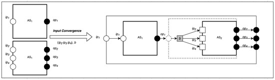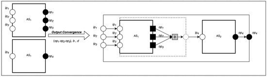 As shown in Figure 3, the output convergence composition takes three parameters: a set of sources (senders) S, a behavior b, and one destination d. The set of sources informs the composition of the number of new communications to create, represented by a directional line with an arrow showing the direction of communication. This can be represented formally as follows: