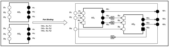 Port binding is a general-purpose composition that merges the outputs ports of one actor system (or composition) with the inputs ports of another actor system or composition. To compose two actor systems configurations and , we provide a set of triples for port-to-port binding whose entries are of the form , where is the output port of , is the input port of to be merged, and b is the provided behavior.