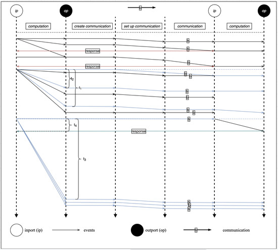 Figure 10 illustrates the runtime event diagram for the SecIoTComm framework. The runtime events diagram illustrates the framework functions, communication properties, actor computations, scalability, and resource sharing among Actor Systems. The horizontal dotted lines represent the time of each event (e.g., , , , and ). Events can be classified as computation, communication, or actor creation event.