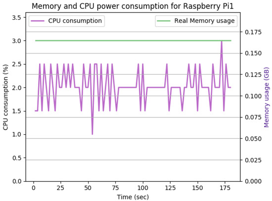 Figure 11 shows the CPU and memory utilization of Raspberry Pi 1 in the idle JVM state when having a fresh security configuration in place. The idle JVM state of a Raspberry Pi device happens when no active functionalities are running on the device, such as communication, computation, or security-related activities. As shown in the figure, the total CPU and memory utilization after initializing the security configurations are negligible overheads at the idle JVM state.