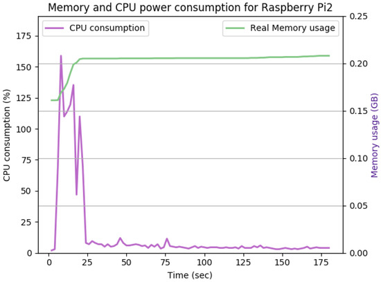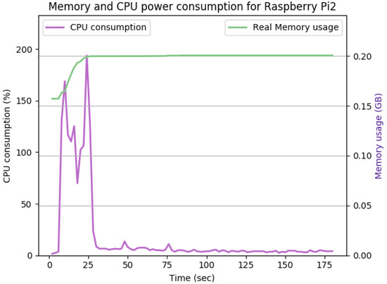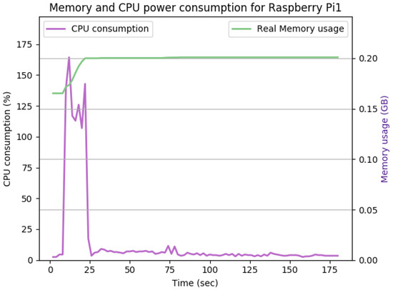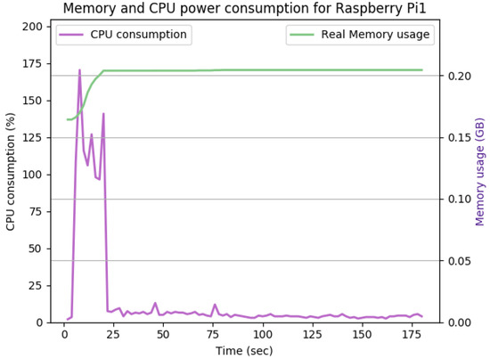 Figure 12, Figure 13, Figure 14, Figure 15, Figure 16, Figure 17, Figure 18 and Figure 19 show the CPU and memory utilization of Raspberry Pi 1 and 2 devices when using different cipher suites with various key sizes. The spike in CPU initialization at the first 25 seconds of the experiment resulted from the overheads of initiating the TCP communication (e.g., three-way handshake process).