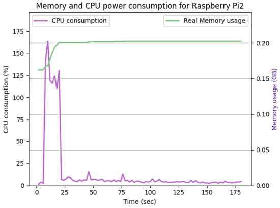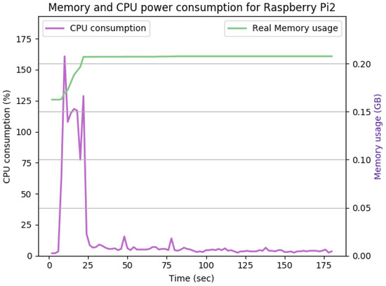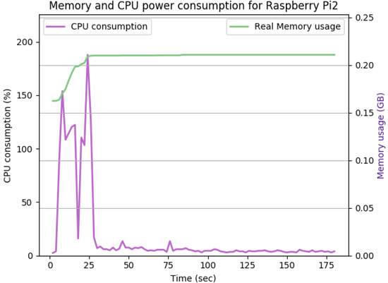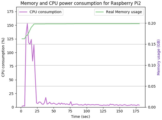 As shown in Figure 14, the TLS handshake occurs in the first 23 s of the experiment. The TLS handshake increases the CPU consumption up to 170%. Such overhead drops to about 5% on average during the remaining time of the experiment. The overall memory overhead is 37 Mb. Comparing the average CPU and memory overhead illustrated in Figure 14 with the idle state displayed in Figure 12, we can conclude that the SecIoTComm framework is lightweight and suitable for resource-constrained IoT devices.