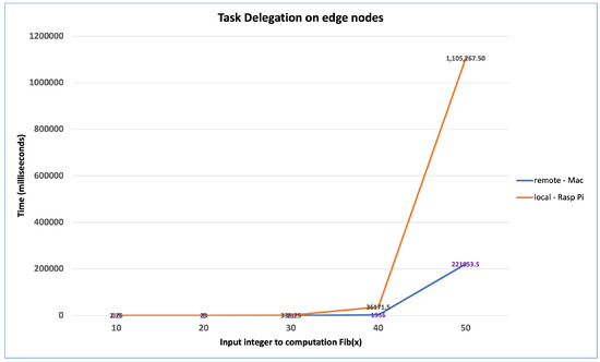 Figure 21 shows the effect of delegating a computationally intensive task from a Raspberry Pi device to a remote server (i.e., MacBook) on the network. The communicated task is to compute the fib(x), where x is a large integer value. As shown in the figure, the total CPU time for computing fib(x) is decreased by a factor of 5 after delegating the task of computing the Fibonacci of 50 to a more powerful server.