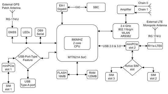 To collect the connectivity and positioning data, a Mikrotik LtAP LTE6 wireless access point and a Single-Board Computer (SBC) were used. LtAP LTE6 is a compact wireless access point with built-in GPS. LTE connectivity was enabled by the Mikrotik R11e-LTE6 LTE modem connected to miniPCIE slot integrated in the Mikrotik LtAP LTE6 access point, as shown in Figure 1. The used LTE modem belongs to the LTE CAT6 category and provides a maximum download speed of 300 Mb/s and an upload speed of 50 Mb/s. The collection system block diagram is shown in Figure 1.
