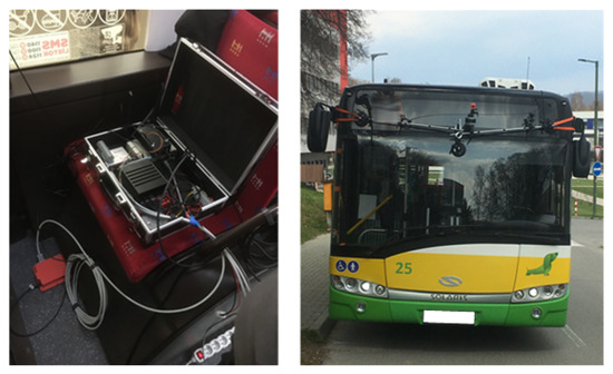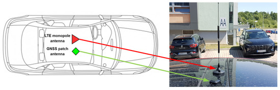 For LTE transmission, an external 3dB wideband monopole LTE antenna with a resonant frequency from 698–2690 MHz and an input impedance of 50 was used. For GPS reception, a Mikrotik ACGPSA external 26 dB, 50 antenna with a resonant frequency of 1575.4 MHz was used. To ensure effective communication, we installed both antennas on the top of the testing vehicle’s roof, as illustrated in Figure 2.