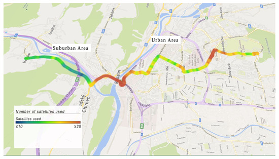 Most GNSS techniques work with as few as five satellites. However, the redundancy is important for a number of reasons. First, the large number of satellites increases GNSS availability by providing service even if local obstructions block a significant part of the sky—a situation very common, especially in urban environments. Second, as demonstrated in [19], the performance of a three-constellation system, which sees only satellites more than 32 degrees above the horizon is equivalent to a single-constellation system in an open-sky scenario. Third, GNSS systems are developed independently, which allows performing cross-checking between constellations, enabling integrity guarantees [20]. Therefore, the average number of satellites as well as the number of available constellations a GNSS receiver can see when driving along the evaluated road segment are important indicators impacting the availability and performance of the localization service.