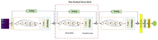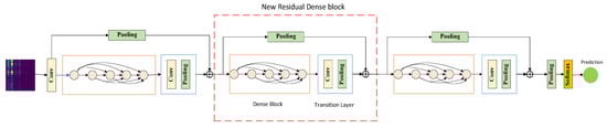 The LR-DenseNet proposed in this paper mainly consists of three parts: a shallow spectrum image feature extraction module, a Local Residual Dense Block (LRDB), and a Dense fault feature abstraction module. The specific network structure is shown in Figure 2. Firstly, the shallow module extracts the features of the input data. Subsequently, each local dense residual module fuses the input shallow level feature information with the features obtained after processing the dense convolution layer, and the feature fusion used here is realized in the form of a short connection. Finally, the operation of feature abstraction and simplification should be added in the process of feature extraction, and the mean pooling layer should be set after the LRDB module, which can further abstract and process the features after fusion. Only the abstract features useful for classification should be retained, which is suitable for complex data structures such as energy spectrum images.