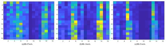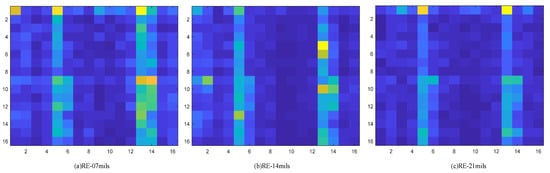 Corresponding energy spectrum matrix of rolling element fault, where (a) represents the type of fault with 7 mils in the rolling element, (b) represents the type of fault with 14 mils in the rolling element, and (c) represents the type of fault with 21 mils in the rolling element.