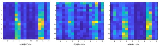 Outer ring fault corresponding to energy spectrum matrix, where (a) represents the type of fault with 7 mils in the outer ring, (b) represents the type of fault with 14 mils in the outer ring, and (c) represents the type of fault with 21 mils in the outer ring.
