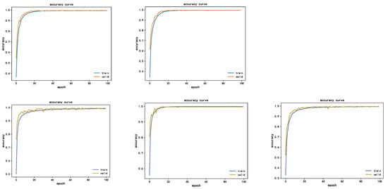 To verify the robustness and generalization ability of the LR-DenseSENet model for bearing fault diagnosis, five data sets were made, in which the sample data of 0HP, 1HP, 2HP, and 4HP were made into four data sets A, B, C and D, respectively, and then the sample data of B, C, and D were combined and split. Data set E is the variable load data set. Training is conducted to observe the adaptability of the model under different load environments. The training results are shown in Table 9.