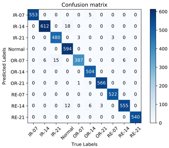 To further demonstrate the recognition effect of LR-DenseNet for different fault types, the Confusion matrix [] is used to further express the model recognition effect visually. The test result shown in Figure 15 is the Confusion matrix, where the horizontal axis represents the real fault label, the vertical axis represents the network prediction of labels, the diagonal axis realizes the correct classification of the number of samples, and the rest of the grid in this picture represents the number of sample classification errors, which at the same time can be understood according to the specific mistake in the horizontal ordinate that determines the kind of fault type.