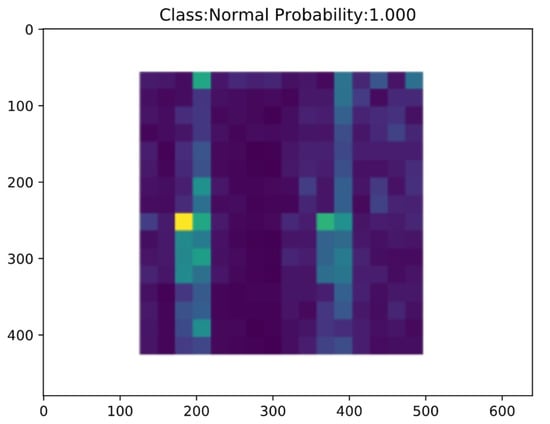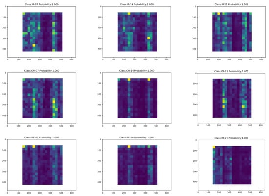 Firstly, the offline training phase of LR-DenseSENet model was carried out, and then the online diagnosis task of fault type was carried out []. The trained LR-DenseSENet model is saved, and then the online diagnosis port is used to diagnose the state categories of feature images in the test set of the divided energy spectrum feature graph by using the designed model, to realize the online diagnosis of faults []. After the input data, the online prediction results of LR-DenseSENet model are shown in Figure 16 and Figure 17.