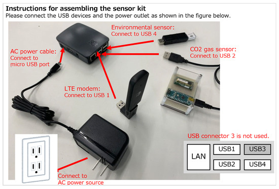 A sensor kit (see Figure 2) was installed in the living room of each house to measure the indoor concentration and temperature. This kit was developed based on the Raspberry Pi 3 B+, and measurement data were automatically uploaded to a cloud server through an LTE modem. concentration was measured using a Figaro CDM7160-C00 gas sensor, which can measure in the range of 360–5000 ppm in 1 ppm increments, with an accuracy of ±(50 ppm + 3%), and is pre-calibrated. An OMRON 2JCIE-BU01 environmental sensor was used to measure indoor temperature. Software programs to collect sensor data were also developed by the authors for the experiments, with each data being collected in real time at 10 s intervals. The installation of this sensor kit required a space that was approximately 20 cm in width and depth, and 15 cm in height. Each sensor costs approximately USD $350, which can be reduced to approximately $150 by minimizing the components to only measure the concentration. The sensor kits were all shipped to the research participants, who assembled and installed them independently following the instructions shown in Figure 3. Sensor kits were requested not to be installed on the floor or near heating and ventilation equipment.