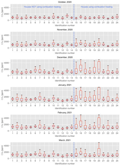 The results shown in Figure 4 indicate that the concentration in many houses with combustion heating equipment (i.e., ID 15–24) had risen significantly since December 2020, reaching between 3500 ppm and 5000 ppm (in rare cases), as compared to houses without combustion heating. This result shows a similar trend to that of the existing surveys [9,10,11]. However, it cannot be concluded from this that the air is clean just because combustion heating is not used, as the concentration reaches around 3000 ppm in some houses (i.e., ID 1–14) that do not use combustion heating at all. This peculiarity is discussed in Section 5.