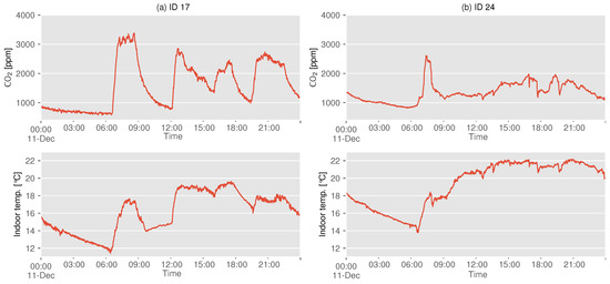 In both types of houses, a sharp increase in the concentration was observed at around 7:00 a.m., and the indoor temperature increased at the same time, which can be attributed to the use of combustion heating. At ID 17, as shown in Figure 5a, the concentration exceeded 3500 ppm in the morning and often reached 2000–3000 ppm during the day thereafter. In contrast, ID 24, as shown in Figure 5b, showed that the concentration reached 2500 ppm for a short period in the morning, but then remained in the range of 1000–2000 ppm. Based on indoor temperature trends, it can be estimated that the occupants of both houses are in the living room from morning to nighttime, or at least continue to use some kind of heating system in these rooms. Therefore, these results suggest that while IDs 17 and 24 use both combustion heating and air conditioning, the former uses combustion heating for a relatively long period of time, while the latter uses it for a short period of time. When participants were interviewed about their heating habits, it was found that occupants of ID 24 used combustion heating only for rapid heating when the indoor temperature was low, and air conditioning was the main heating source for the rest of the day. This difference in behavioral habits can be seen in the difference in concentration distribution after December, as shown in Figure 4.
