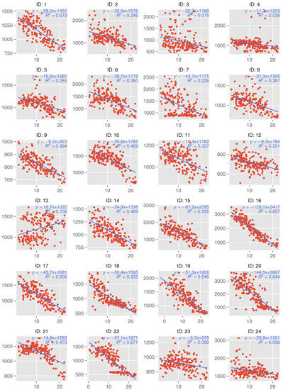Figure 6 shows the daily averages of outdoor temperature and indoor concentration inside houses, values for which are plotted on a scatter plot. Each plot shows the fitting line, its equation, and the coefficient of determination . Note that the range taken by the vertical axis depends on the concentration distribution of each house, in order to show the relative trend.
