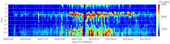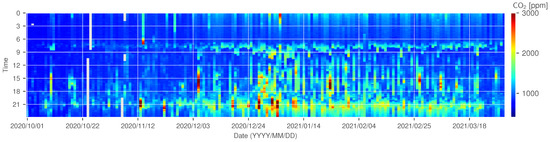 The concentration is an indicator of the retention of harmful substances, as its concentration increases with inadequate ventilation in buildings [18,19,20,21,22]. Many countries have regulatory standards and guidelines to maintain concentrations below a fixed level (around 1000 to 1500 ppm) within buildings such as offices, schools, and houses [18,22,23]. The concentration also increases with human breathing; in addition to being an indicator of the retention of harmful substances, high concentrations are also known to increase the risk of respiratory diseases, impair thinking, and lower concentration [24,25,26,27]. It has also been reported that high concentrations of can affect the quality of sleep as well as overall performance the next day [28].