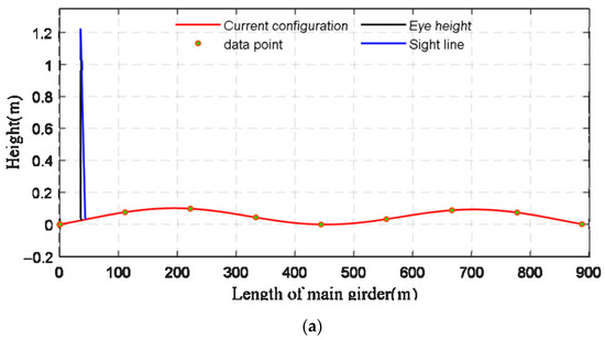 - The module for real-time dynamic configurations: This module is used to realize dynamic configurations in real time. The method employs the recursive least squares method to correct the data baseline, filters the low-frequency noise of the monitoring acceleration signal through recursive high-pass filtering, and then synchronously integrates the acceleration signals to obtain the dynamic displacements of the main beam at multiple positions. With displacements serving as the controlled points, the dynamic configurations in real time are generated by function fitting.