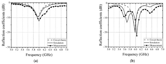 Figure 2 shows the equivalent circuit model of a patch antenna and a wire located above patch antenna. The patch antenna can be modeled as a parallel resistance (Rp), capacitance (Cp), and inductance (Lp). Since the wire also can be modeled as a parallel resistance (Rh), capacitance (Ch), and inductance (Lh), and a capacitance (Cg) can be generated between the patch antenna and the wire, the equivalent circuit model of the wire above patch antenna is represented by Figure 2b. To produce capacitive coupling between the patch antenna and the wire at dominant mode, the wire must be positioned in the direction of the feeding point and center of patch antenna, as shown in Figure 1b. The circuit parameters of the patch antenna with operation frequency of 5.8 GHz in the Figure 2a were obtained with Rp = 57.7 Ω, Cp = 8.96 pF, and Lp = 0.084 nH. The circuit parameters of non-defect wire are as follows: Ch = 10.08 pF, Lh = 0.068 nH, and Rh = 43 Ω. In addition, the circuit parameters of defective wire are as follows: Ch = 6.8 pF, Lh = 0.097 nH, and Rh = 103.8 Ω. Since the induced current from the patch antenna decreases due to the defect, the shunt resistor (Rh) of the defective wire increases compared to that of non-defect wire. Next, the reflection coefficient of the patch antenna is lower than that of the non-defect wire, as shown in Figure 3. The utilized simulator and vector network analyzer (VNA) are commercial ANSYS Electronics desktop software (2021) and Anritsu MS46522B, respectively. The compared results show excellent agreement except for an additional parasitic resonance by the interaction between patch antenna and wire. The measured reflection coefficients of patch antenna at the resonant frequency in cases of non-defect and defective wires are about −12.4 dB and −22.4 dB, respectively.