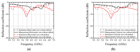 Full-wave simulated and measured reflection coefficients of patch antenna in cases of wires without and with defect. (a) Horizontal wire. (b) Vertical wire.