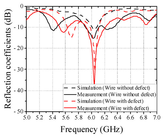 Full-wave simulated and measured reflection coefficients of upper patch antenna in cases of wires without and with defect.