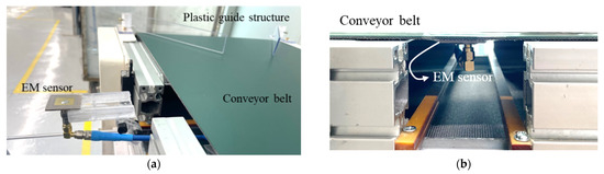 Photograph of experiment setup including EM sensor. (a) Before mounting below conveyor belt. (b) After mounting below conveyor belt.