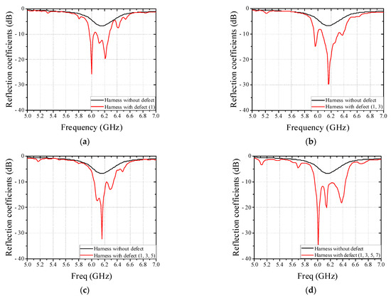 Measured reflection coefficients of patch antenna in cases of real flat harness (7 wires) without and with defect according to defect location. (a) Defective wire: 1. (b) Defective wire: 1 and 3. (c) Defective wire: 1, 3, and 5. (d) Defective wire: 1, 3, 5, and 7.