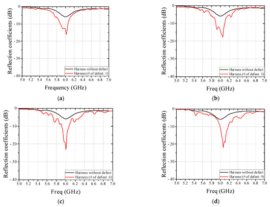 Measured reflection coefficients of patch antenna in cases of real circular harness (9 wires) without and with defect according to the number of defective wire. (a) The number of defective wire: 1. (b) The number of defective wire: 3. (c) The number of defective wire: 6. (d) The number of defective wire: 9.
