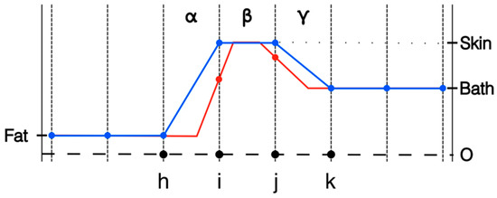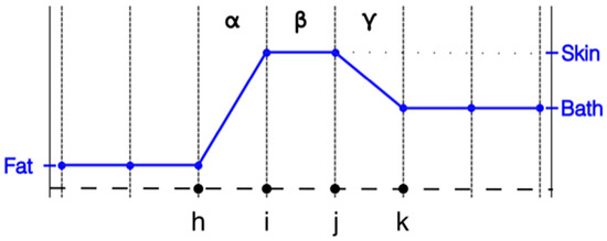 However, this configuration is not always practical for different modeling situations. For instance, in the image reconstruction configuration used by our group, we utilize the nodal adjoint method for computing the Jacobian matrix during the imaging process. The adjoint method has shown to be a significant improvement over alternate ways of computing the Jacobian, and recent innovations have further improved the computation time to the point that that it is no longer a time limiting computation factor [30]. A key feature in this scenario is that the properties need to be represented at the nodes and not the elements. For this scenario the properties vary linearly across the element with different values defined at each of the nodes. With respect to modeling purposes, the associated stiffness matrices are constructed as an integration process over all the elements. The contributions from each node are computed as part of weak form integrations as a preliminary step towards computing the associated field distributions—which are calculated at each node. The challenge in this situation is that the properties are no longer stepwise constant across the elements. A case can be made that this configuration approximates a stepwise change from one node to the next at their midpoint. It approaches a realistic interpretation as the length of element β shrinks (Figure 1).