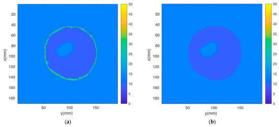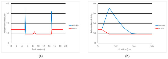 Two-dimensional FDTD permittivity distributions through the breast for cases (a) with and (b) without skin.
