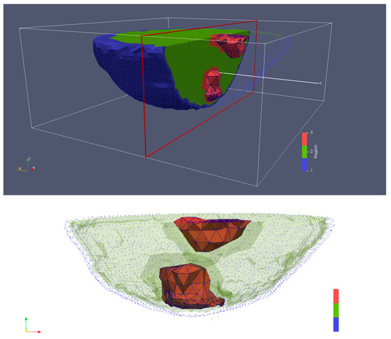 3D finite element mesh generated from an MRI of an actual human breast suspended in a glycerin:water bath—blue for skin, green for adipose tissue, and red for fibroglandular tissue.