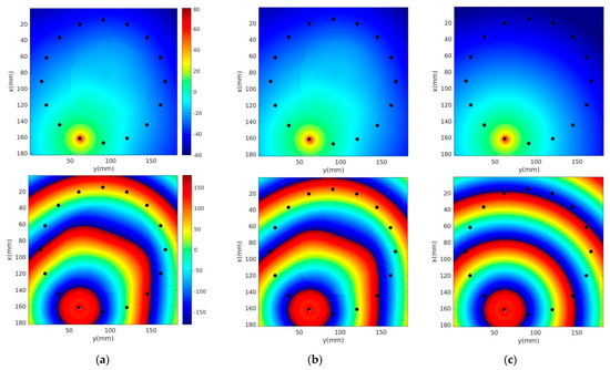 1300 MHz Ez magnitude (top) and phase (bottom) distributions of a single horizontal plane for the cases (a) with and (b) without skin, and (c) the homogeneous bath. Black dots correspond to antenna locations.