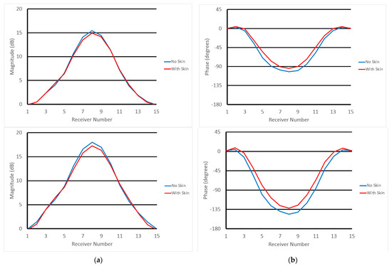 Figure 7 shows normalized (a) magnitude and (b) phase values with and without skin at the associated receive antenna locations in the same plane as the transmitter (top—plane 1, bottom—plane 2). Data in Figure 7 are calibrated through a process in which measured magnitudes and phases are subtracted from the same data acquired in a homogeneous bath (with no breast or phantom). Accordingly, 0 dB means no magnitude difference exists in data acquired when the object is and is not present. Similarly, 0 degrees represents no phase difference in the subtracted data. For the magnitude graphs, differences between the skin and non-skin cases are small, and mostly visible for the receive antennas physically furthest from the transmitter (relative receive antennas 1 and 15 are adjacent to the transmitter and the remaining ones are numbered circumferentially such that #8 is furthest from the transmitter). However, even these differences are only 0.61 and 0.82 dB in the worst cases, respectively, with average differences (over all receive antennas) between skin and non-skin cases of 0.20 and 0.40 dB, respectively. The situation is similar for phase graphs where the largest differences occur near antenna 8, and have maximums of 14.1 and 21.5 degrees and averages of 6.87 and 12.2 degrees, respectively.